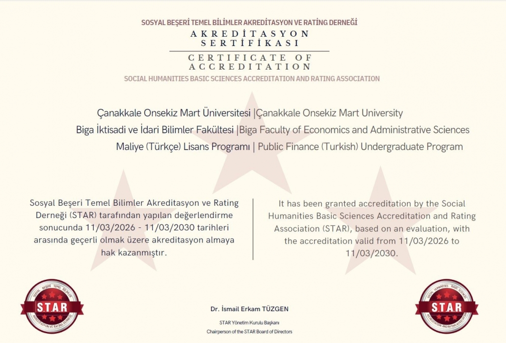 Çanakkale Onsekiz Mart Üniversitesi Biga İktisadi ve İdari Bilimler Fakültesi Maliye Bölümü Maliye Lisans Programı, Sosyal Beşeri ve Temel Bilimler Akreditasyon ve Rating Derneği (STAR) tarafından yapılan değerlendirmeler sonucunda 11 Mart 2026-11 Mart 2030 tarihleri arasında geçerli olmak üzere 4 yıl süreyle akredite edilmiştir. Söz konusu akreditasyon sürecinde program; eğitim-öğretim faaliyetleri, akademik kadro yapısı, araştırma ve geliştirme çalışmaları, fiziki ve teknolojik altyapı, öğrenci destek hizmetleri ile kalite güvencesi sistemi açısından kapsamlı bir değerlendirmeye tabi tutulmuştur. Yapılan incelemeler sonucunda Maliye Lisans Programının ilgili kalite standartlarını sağladığı ve eğitim-öğretim faaliyetlerini sürdürülebilir bir yapı içerisinde yürüttüğü tescillenmiştir.